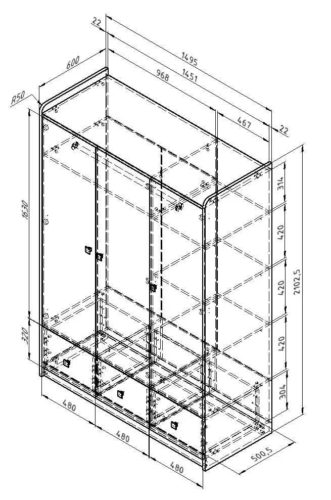 Ширина (мм): 1500 Высота (мм): 2103 Глубина (мм): 600 Материал: ЛДСП Цвет: Белый/Белый, Белый/Голубой, Белый/Оранжевый, Белый/Розовый Вес, кг: 155 Объем, м3: 0.31 Количество упаковок: 4 Коллекция: Дельта Сильвер