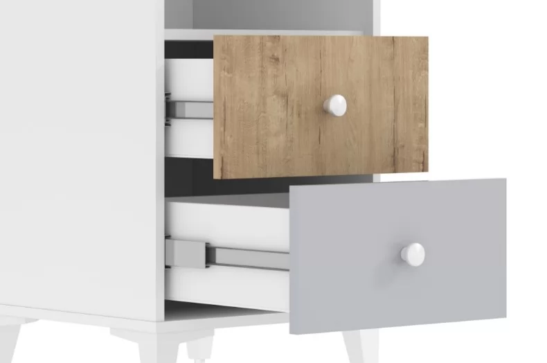 Шкаф «Морти» на высоких изящных ножках предназначен для тех, кто любит простоту и минимализм. Шкаф обладает модным сочетанием материалов и, благодаря характерным декоративным особенностям, понравится всем поклонникам скандинавского стиля. Отделение с полкой и штангой предназначено для хранения одежды на вешалках, головных уборов, коробок с аксессуарами. Два выдвижных ящика предназначены для сложенной одежды, аксессуаров, личных вещей.
