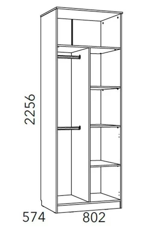 Ширина (мм): 802 Высота (мм): 2256 Глубина (мм): 574 Цвет: Белый/Дуб сонома Материал: ЛДСП/МДФ Вес, кг: 87 Объем, м3: 0.194 Количество упаковок: 3 Гарантия: 24 месяца Коллекция: Фанк Петли: Накладная 90 Ручка: С-31, ручка-скоба пластик Наличие ящиков: Нет Количество дверей: Двухдверный