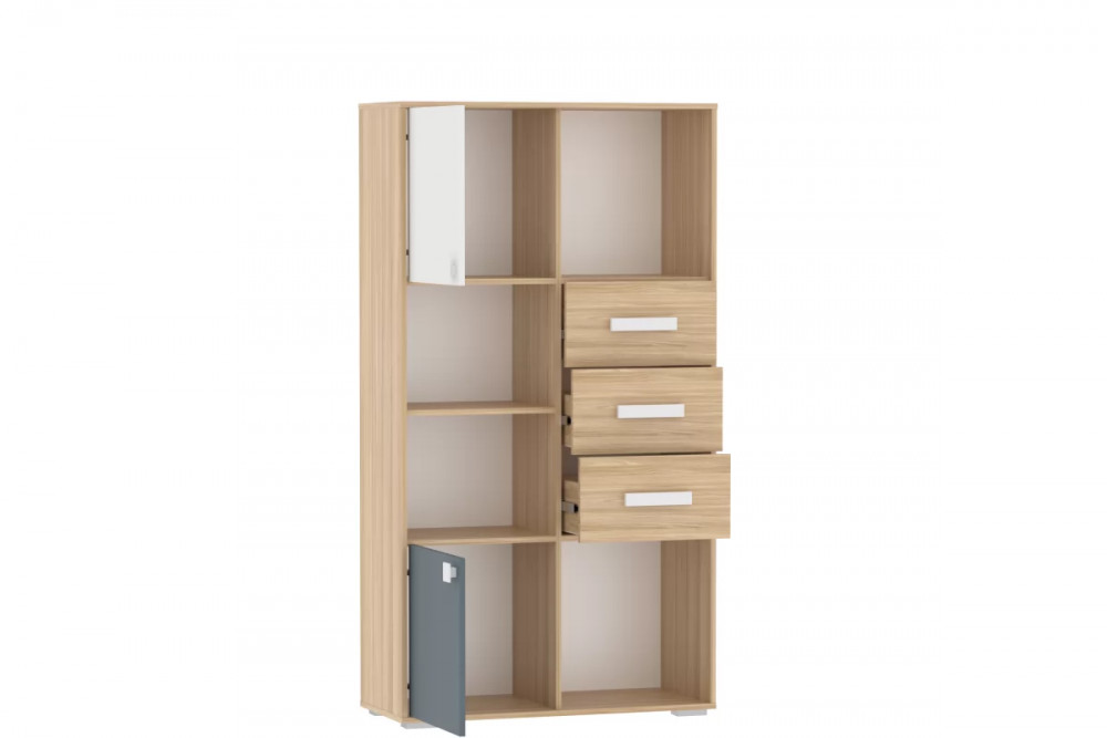 Стеллаж из новой коллекции детской мебели Элиот выполнен в нейтральных оттенках песочного, белого и контрастного маренго – цвета темной морской волны, что позволяет вписать стеллаж в интерьер спальни как девочки, так и мальчика, придав комнате современный и стильный вид. Стеллаж оснащен двумя полками с распашными дверками и тремя выдвижными ящиками, а открытые системы хранения позволяют расставить на видных местах сувениры, книги и украсить комнату так, как нравится ребенку. Для выдвижения ящиков используются шариковые направляющие, которые равномерно распределяют вес содержимого и обеспечивают плавный бесшумный ход ящика. Двери могут крепиться как на левую, так и на правую стенки. Стеллаж помогает поддерживать порядок и расширяет пространство для хранения вещей ребенка. Дополните стеллаж шкафом для одежды из одноименной серии, чтобы создать гармоничную атмосферу!