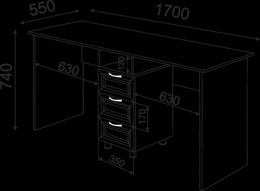 Стол разделен тумбой на квадратных опорах высотой 55 мм, серого цвета.