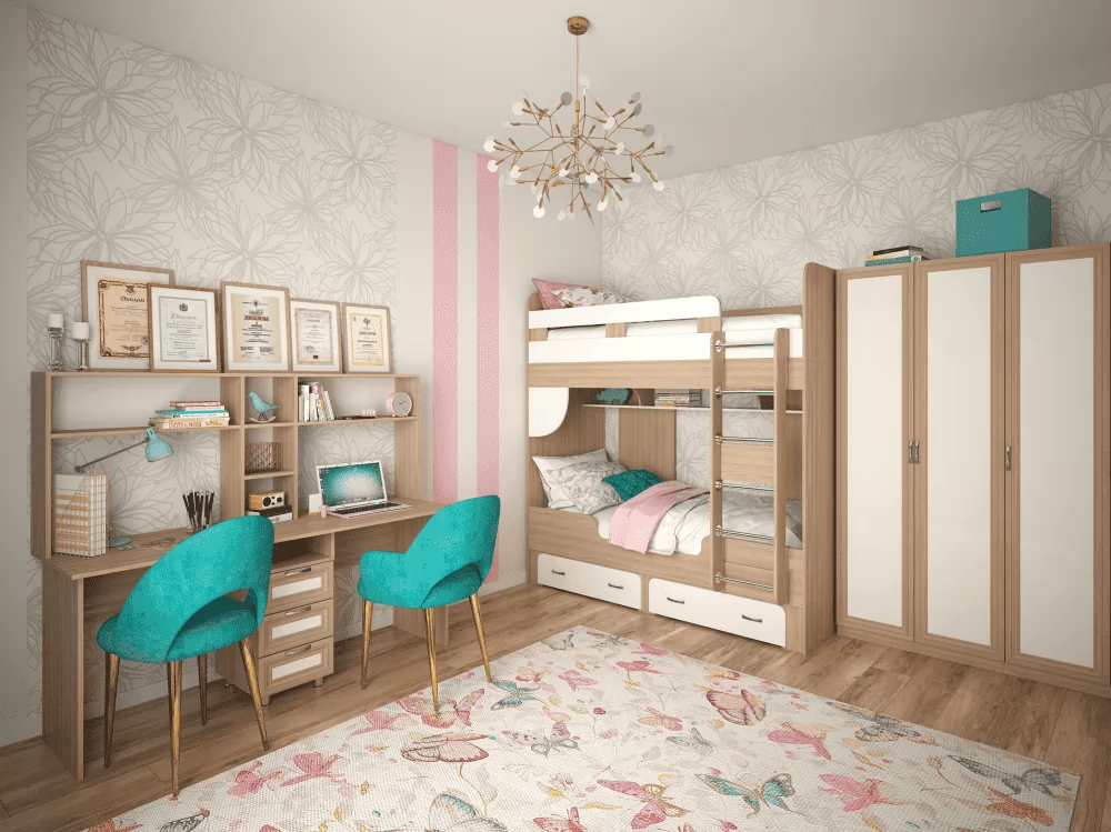 Стол рассчитан на два рабочих места и предназначен для обстановки комнаты двоих детей.