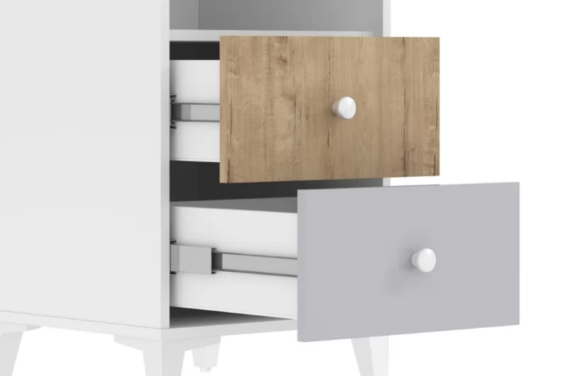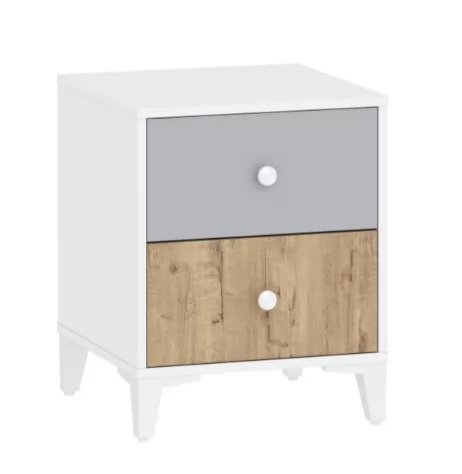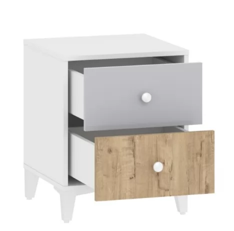 Прекрасным дополнением к интерьеру  спальни станет прикроватная тумба из коллекции «Морти». Лаконичные формы, прямые линии и натуральные светлые природные оттенки – отличительные черты коллекции. Главной изюминкой модели являются контрастные выдвижные ящики, высокие опоры и минималистичные ручки. Высота ножек позволяет с легкостью проводить уборку. Удобная высота тумбы позволяет разместить светильник и с комфортом читать книгу перед сном. Наличие двух выдвижных ящиков позволяет положить в них любимые мелочи, сохраняя при этом порядок в комнате. Направляющие полного выдвижения позволят использовать каждый сантиметр ящиков.