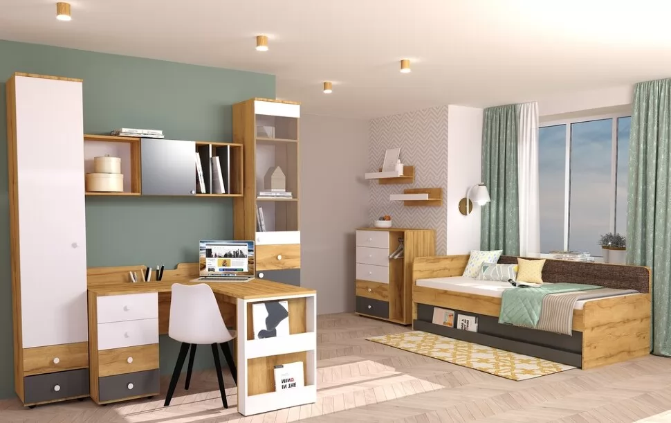 Набор детской мебели «Лео» №3 Гикори джексон/Белый матовый/Дымчатый зеленый
