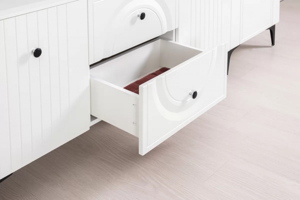 Фасады выполнены из МДФ с матовой ПВХ-плёнкой. Такое решение делает мебель визуально более "мягкой", комфортной и расслабляющей.