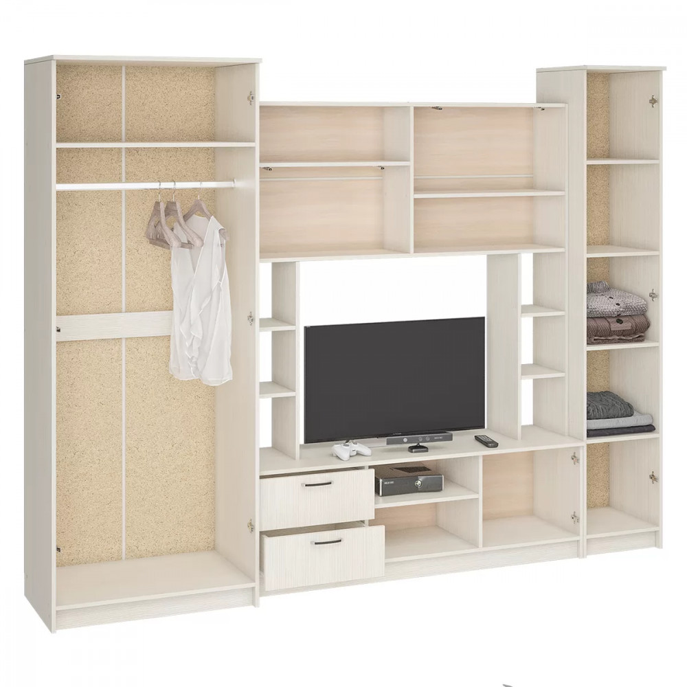 Многофункциональная и практичная гостиная выполнена в современном дизайне - Гостиная состоит из трёх модулей (шкаф платяной, шкаф бельевой, средняя секция), которые при желании можно устанавливать отдельно друг от друга, размещая в разных комнатах - Размер средней секции (ШхВхГ): 1500х1940х420 мм - Ниша под ТВ: 1000х800 мм, для моделей телевизоров с диагональю до 43" - Размеры платяного шкафа (ШхВхГ): 800х2100х530 мм - Платяной шкаф комплектуется горизонтальной штангой - Размеры пенала (ШхВхГ): 400х2100х430 мм - Зеркало 4 мм, с пескоструйной обработкой - Ручка пластик - Сборка универсальная, собирается как на левую, так и на правую сторону -Фасад можно перенавесить как на правую, так и на левую сторону