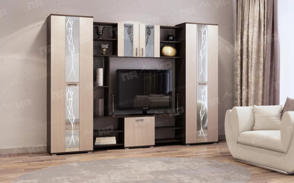 Гостиная "Прага" - это классическая среднегабаритная зальная стенка. В гостиной «Прага» применяются современные декоры, а фасадная часть украшена зеркалами и стеклами с пескоструйным рисунком. Все элементы гостиной устанавливаются на регулируемые ножки-опоры. Мебель изготавливается из ЛДСП зарекомендовавших себя заводов «Kronospan», «Увадрев-Холдинг», «ВохтогаЛесДрев».