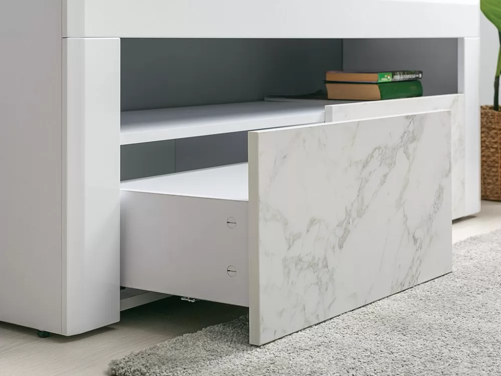 Тумба под ТВ Пьер 13.264 будет отличным дополнением интерьера любой комнаты. Изделие поможет разместить телевизор для более комфортного просмотра новостей, сериалов и различных телепередач. Открытая ниша предназначена для необходимой аппаратуры. А два выдвижных ящика пригодятся для хранения различных вещей и предметов. Направляющие выдвижных ящиков имеют скрытый монтаж и регулировки фасада. Кроме того, они имеют повышенную грузоподъёмность и оснащены доводчиками. Регулируемые опоры позволяют легко компенсировать неровности пола.
