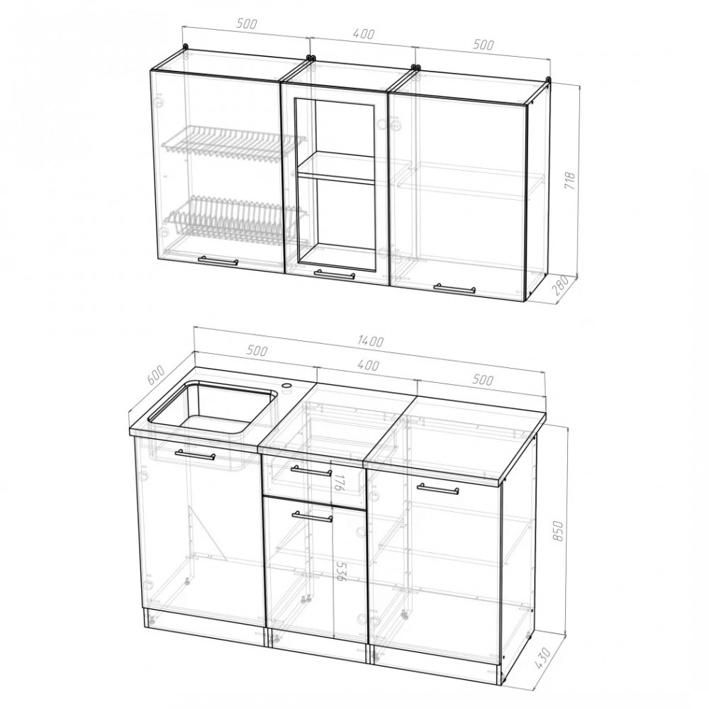 Мойки, смесители и посудосушители в комплекты гарнитуров не входят.