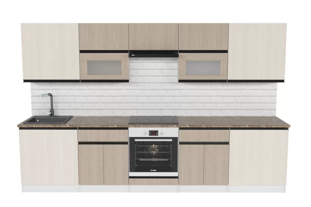 Прямые готовые кухни рациональны для маленьких квартир. При прямой планировке кухни важно предусмотреть место для холодильника и учесть его габариты. Если ваша кухня объединена с гостиной, или же настолько просторная, что позволяет сделать полноценную обеденную зону для большой семьи, то смело выбирайте линейную конфигурацию кухни.