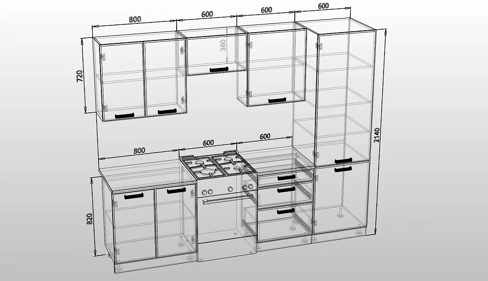 Габаритный размер готового набора модулей с учетом газовой плиты на 60см: 660 см.