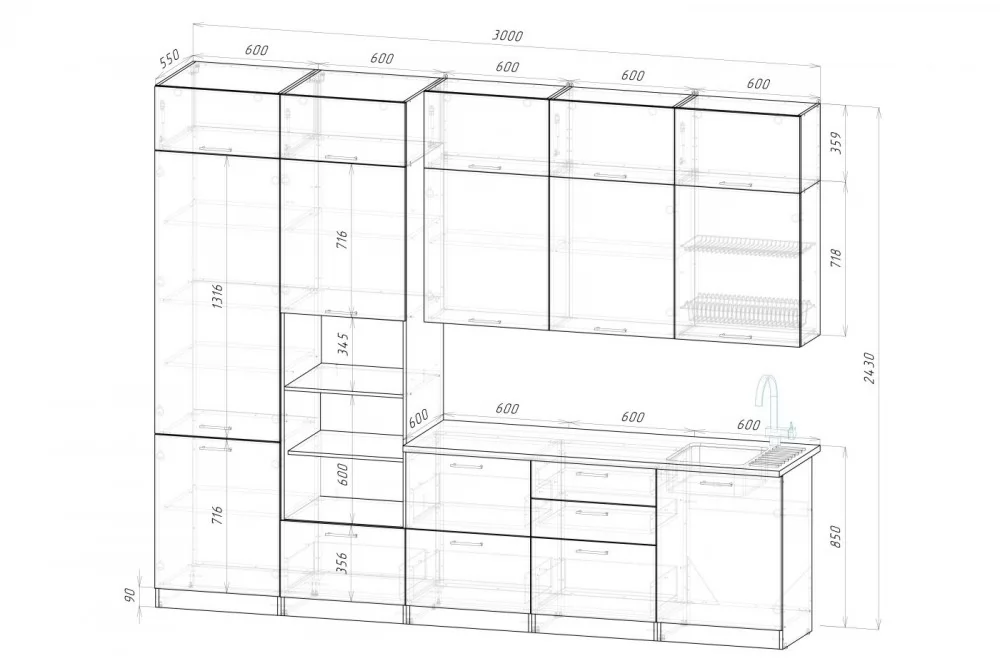 Мойки, смесители и посудосушители в комплекты гарнитуров не входят.