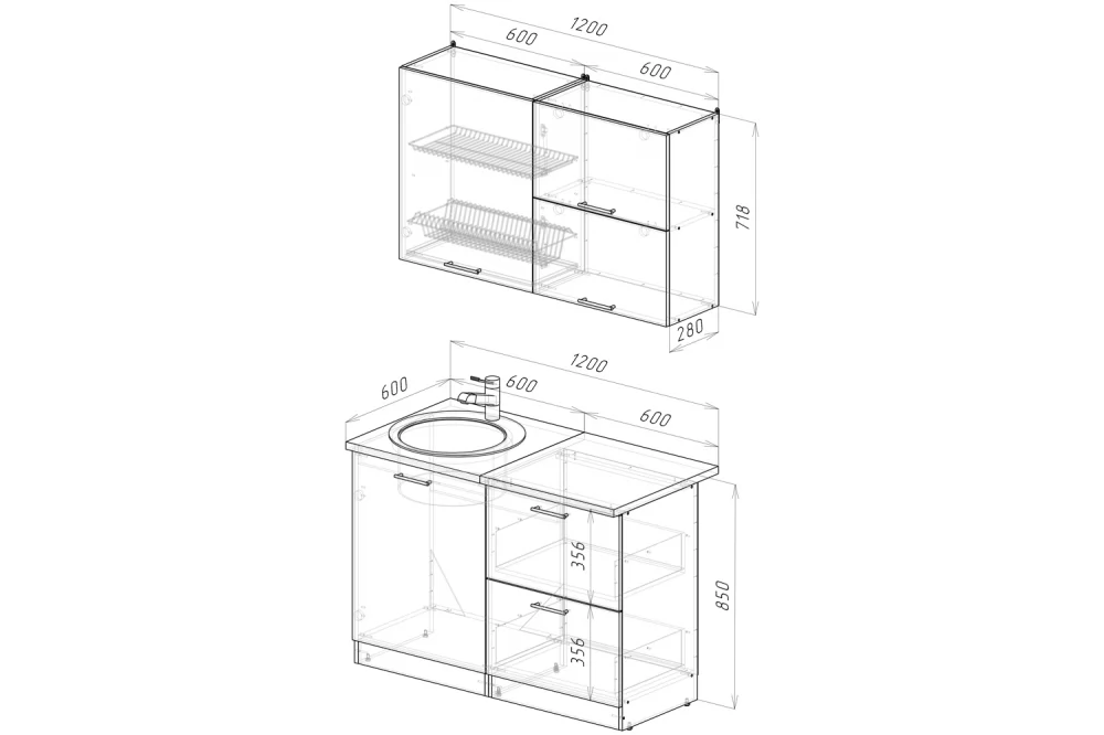 Мойки, смесители и посудосушители в комплекты гарнитуров не входят.