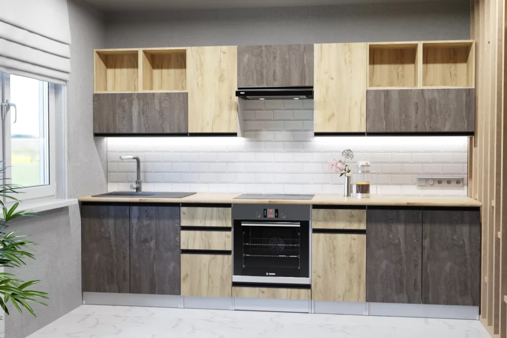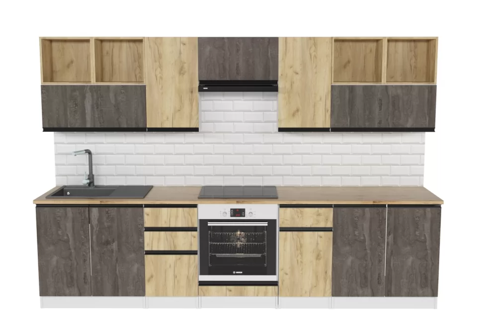 Кухонный гарнитур Виола Эккстра из ЛДСП в модном цвете "Бетон тёмный" впишется в современный дизайн интерьера. Подойдет как для частного дома, так и для небольшой квартиры. Напольные и подвесные шкафы позволят разместить всю кухонную утварь. Гарнитур состоит из набора шкафов, которые органично комбинируются между собой. Ящики, полки, навесные шкафы, тумбы и пеналы можно менять местами, создавая практичное рабочее пространство. Стильные и функциональные готовые кухни - это не только комфорт и уют в доме, но и эстетика.