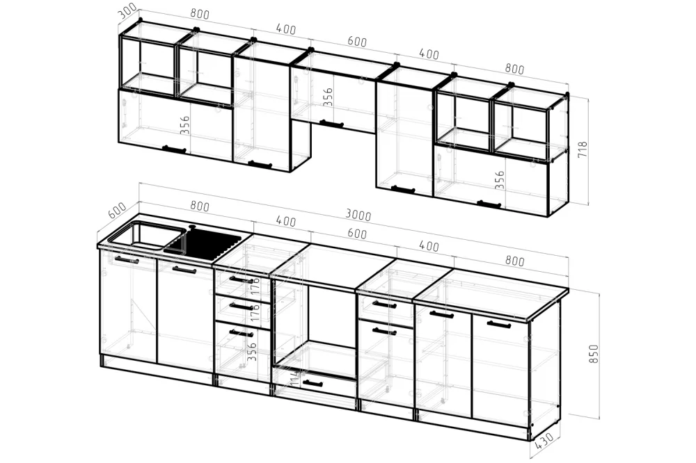 Мойки, смесители и посудосушители в комплекты гарнитуров не входят.