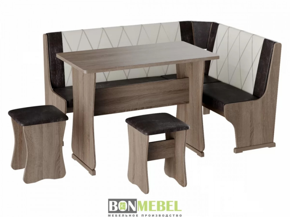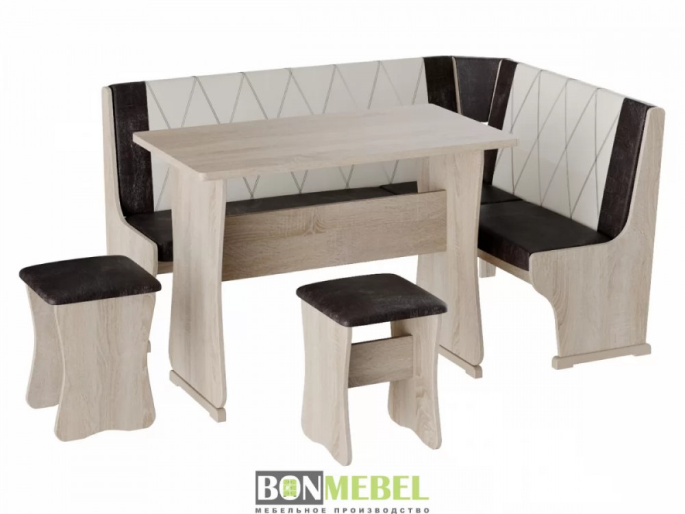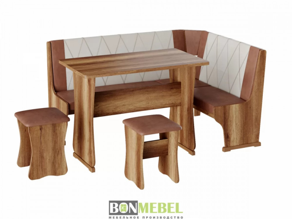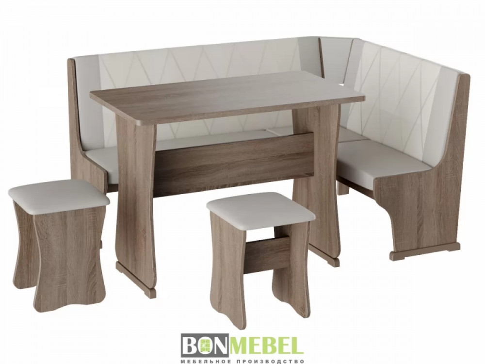 Кухонный уголок Гамма тип 2 со столом и табуретами представлен в нескольких вариантах расцветки, что позволит вам выбрать исполнение, идеально подходящее к интерьеру. Универсальная сборка позволяет выбрать ориентацию угла скамьи при сборке. Обивка из экокожи устойчива к различным загрязнениям и не требует обработки специальными средствами. Вместительность несмотря на компактные габариты набора, композиция идеально подойдет для размещения четырех персон. Для изготовления изделий используется ЛДСП. Обивка скамьи и табуретов произведена из искусственной кожи.