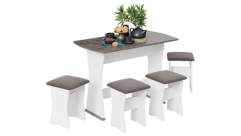 Назначение: Мебель для работы и приема пищи Гарантийный срок: 18 месяцев Комната использования: Кухня Стиль: Современный Габаритная длина: 1 100 Тип: Обеденная группа Расположение: Напольный Материал каркаса: ЛДСП Размеры стола: 1100х600х760 Дополнительная информация: Комплектация : стол + 4 табурета, материал мягкого сидения - кожзам. Производство: Россия Габаритная ширина: 600 Габаритная высота: 760 Размеры табуретов: 340х340х430 Срок службы: 5 лет Оттенок: Белый, Асфальтный Цвет: Белый/Ателье темный/Иск.замша Stone Обивочный материал: Искусственная замша Цвет каркаса: Белый/Ателье темный Оттенок каркаса: Белый, Асфальтный Оттенок обивки: Асфальтный Цвет обивки: Иск.замша Stone Материал столешницы: ЛДСП Заглушина для ящика кровати в комплекте: Нет Наличие механизма раскладки: Нет Наличие спального места: Нет