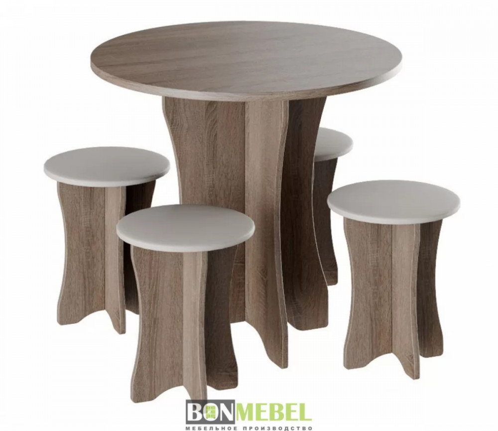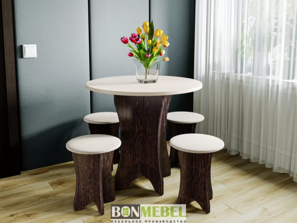 Обеденная группа Тип-6 отличается простым, но привлекательным стилем. Композиция без труда вольется в любой современный интерьер, сделав кухонное пространство более практичным и уютным. Обивка из экокожи обладает износостойкостью, устойчивостью к загрязнениям и не прихотлив в уходе. Мягкие сиденья табуретов имеют мягкий и упругий слой, что создает максимально комфортные условия для сидящего. Классическое контрастное сочетание цветов сделает любой интерьер интересным и гармоничным. Для изготовления моделей используется прочная ЛДСП. Обивка табуретов произведена из искусственной кожи.