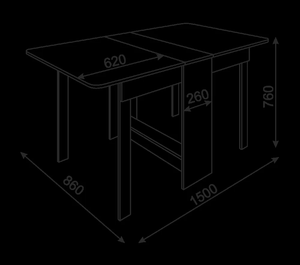 Размеры: Габарит ширина: 860 мм Габарит глубина: 300 мм (1500 мм в разложенном виде) Габарит высота: 760 мм