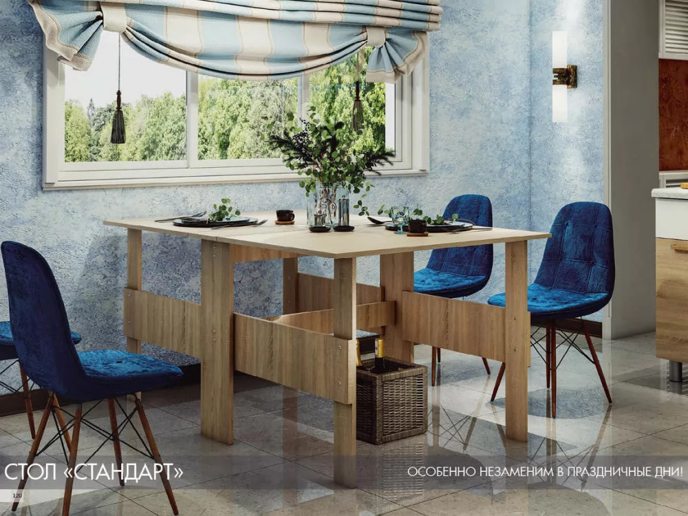 Практичный вариант для малогабаритного помещения – стол-книжка Стандарт. Габариты в разложенном виде (ШхВхГ): 1000х750х1600 мм.