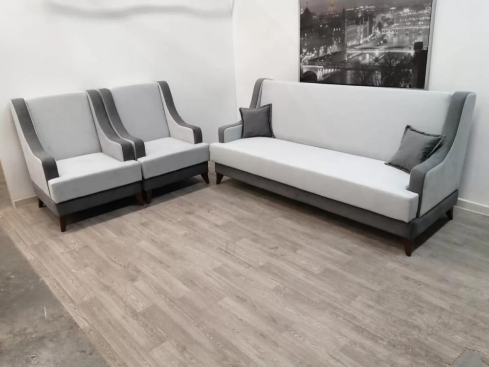 Описание дивана: Каркас - древесина хвойных пород Способ раскладки - "Книжка" Бельевой короб - ЛДСП Спинка, сиденье- независимый пружинный блок 120 мм, ППУ высокой плотности 30 мм Обивка - под заказ Опоры - пластиковые изделия Габариты- 2100*980*800 Спальное место - 1900*1200 Размеры кресла: 750*850*1020 Объем - 2,8 м3
