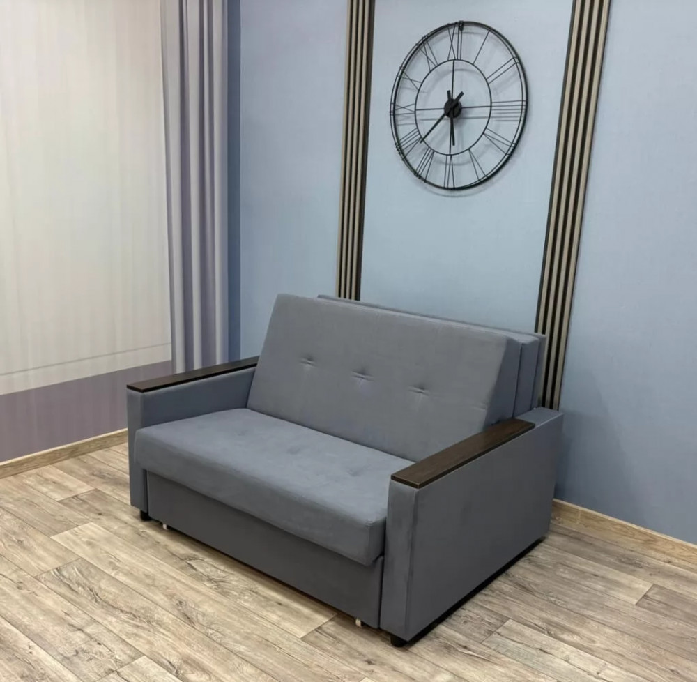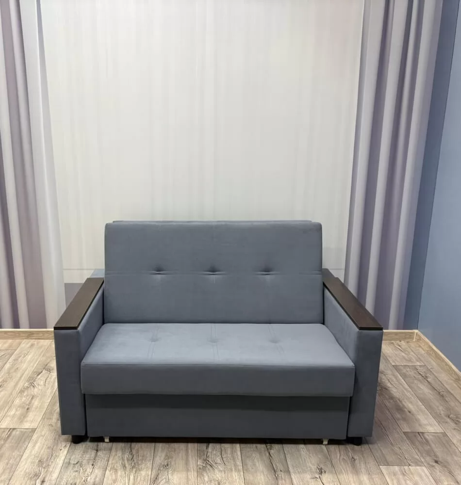 Каркас – древесина хвойных пород Способ раскладки – "Аккордеон" Бельевой короб - ЛДСП Подлокотники - съемные Спинка – ППУ высокой плотности высотой 90 мм Сиденье – ППУ высокой плотности высотой 90 мм Обивка – под заказ Опоры – пластиковые изделия Габариты – 1440*1060*900мм Спальное место – 1200*1950мм Объем – 1,3м3