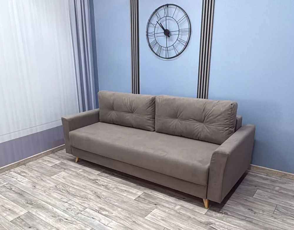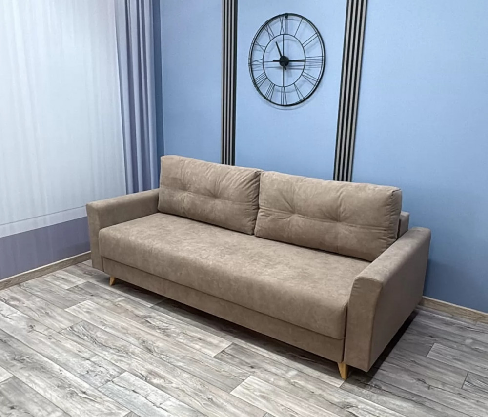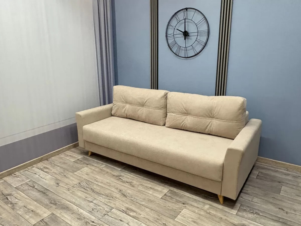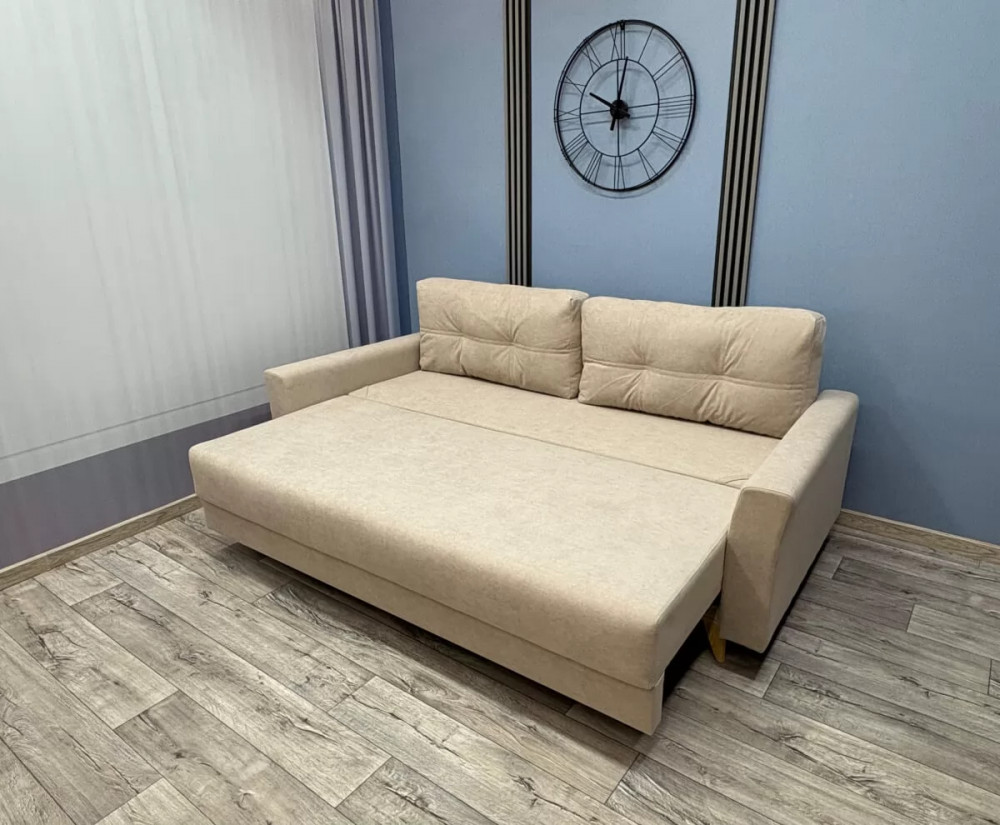 Каркас - древесина хвойных пород Способ раскладки –«Евро-книжка» Механизм - "Пантограф с ногой" Подушки - гипоаллергенный "Микс" Спинка, сиденье - независимый пружинный блок 120 мм, ППУ высокой плотности 30 мм Бельевой короб - ЛДСП Обивка - под заказ Опоры - пластиковые элементы Габариты - 2360*1090*900мм Спальное место - 2000*1530мм Объем - 1,5 м3