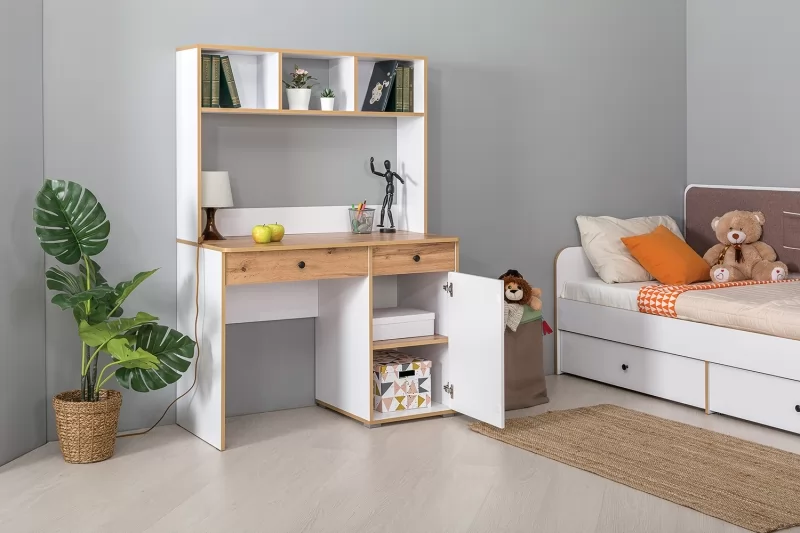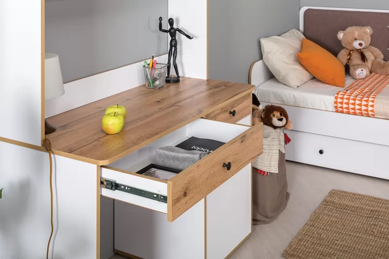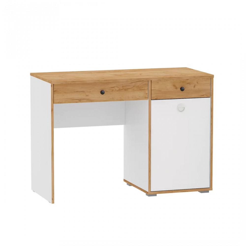 Стол письменный Вуди 12.42 будет отличным дополнением интерьера уютной детской. Изделие поможет создать необычайно комфортное рабочее место. Модель имеет широкую столешницу, на которой можно разместить ноутбук, стопку книг и при этом спокойно делать записи в тетради. Тумба с дверцей и два выдвижных ящика пригодятся для хранения всех необходимых принадлежностей.