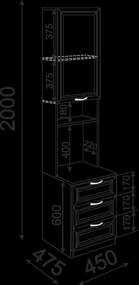 Размеры: Габарит ширина: 450 мм Габарит глубина: 475 мм Габарит высота: 2000 мм Ящик (кол-во, габарит, нагрузка): 120х361х383мм-3шт Расстояние между полками, мм: 180-400мм