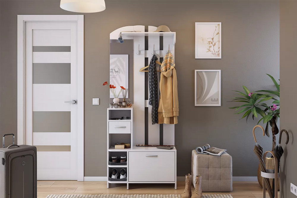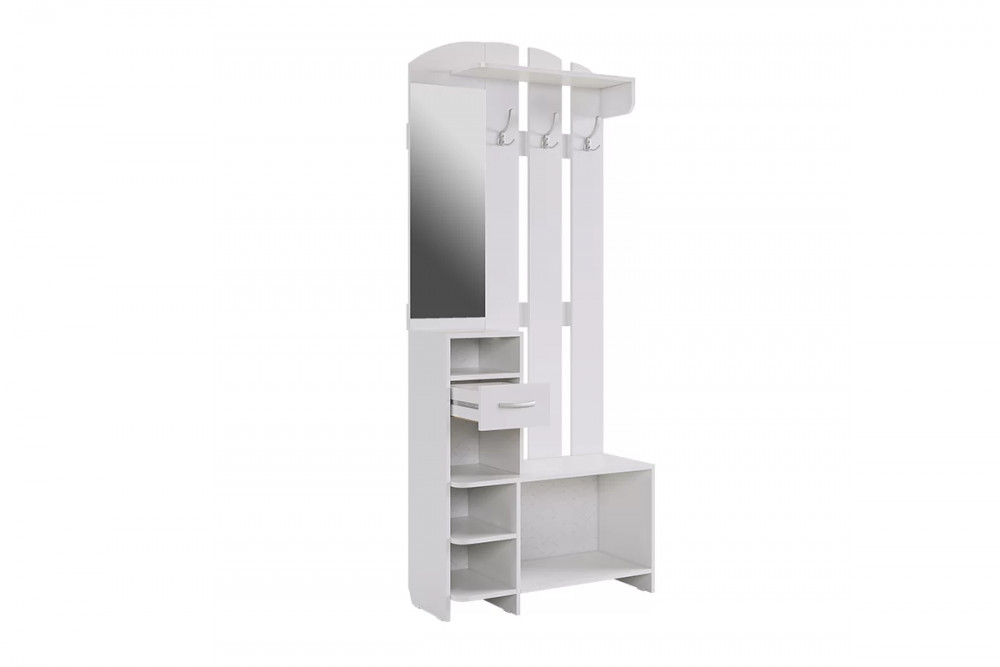 Состоит из: полок, вешалки с крючками для одежды и сумок, обувницы, открытых полок, зеркала, полки для головных уборов, выдвижного ящика. Сборка универсальная.