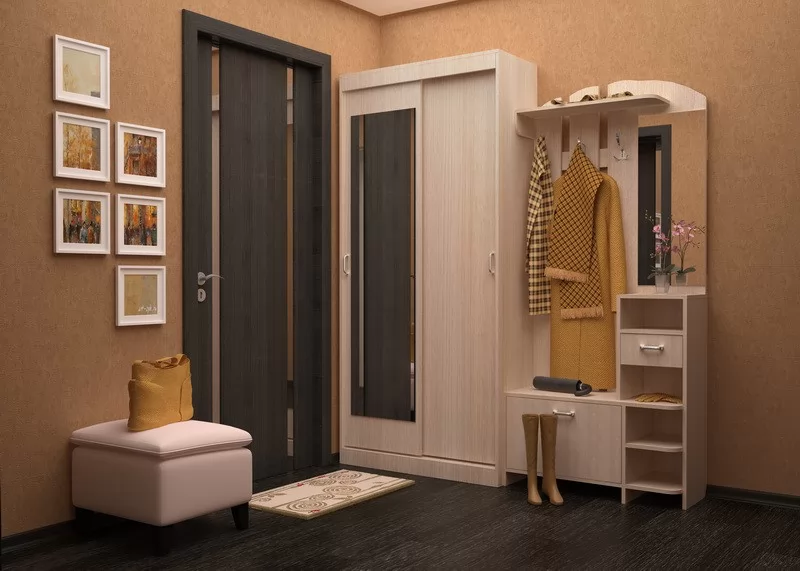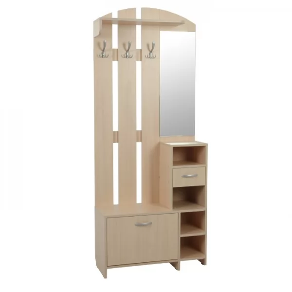 «Мила» создана для Вашей прихожей – Вы можете повесить одежду  и сумку на металлические крючки, шляпки положить на полку сверху, нужные мелочи – в выдвижной ящик. На  открытых полках можно разместить зонты, перчатки и шарфы. Есть зеркало и обувница.