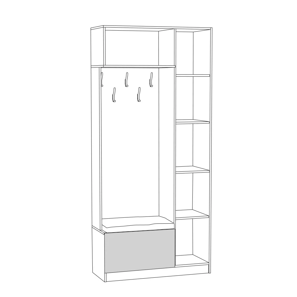 Шкаф для прихожей "Ливерпуль" №13.21 состоит из открытой ниши с крючками для верхней одежды, закрытого вертикального блока с полками и двух ящиков для хранения необходимых предметов. Верхний ящик оснащен откидной дверцей, а нижний имеет выдвижной механизм. Поверхность нижнего ящика оборудована мягким элементом, на который можно присесть для переобувания.