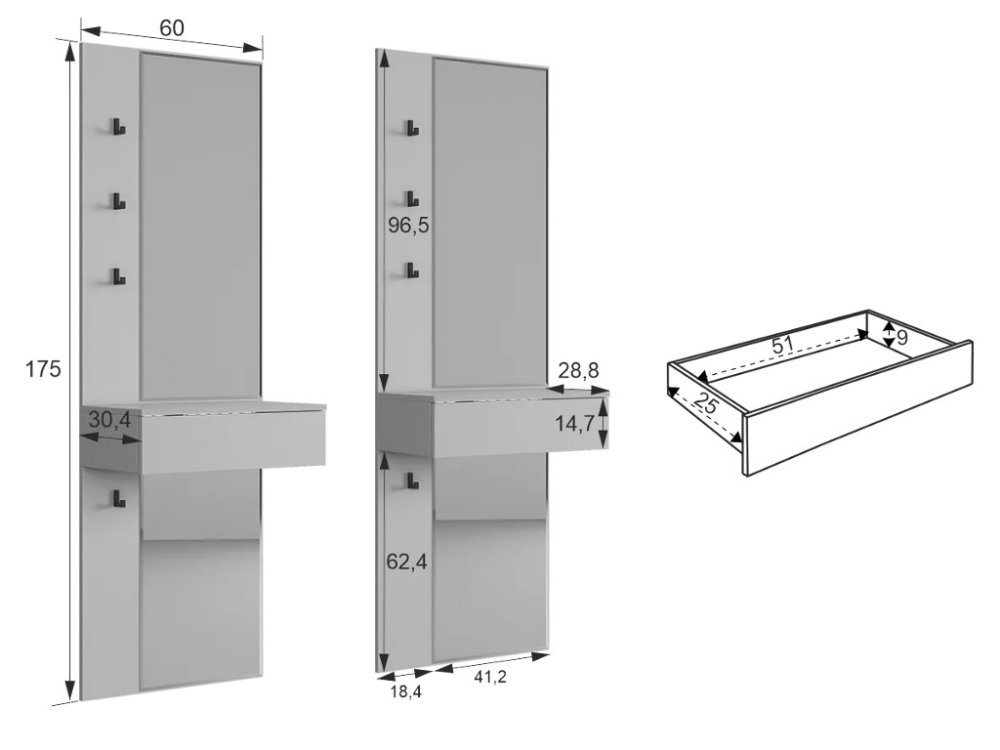 Крючки предоставляют удобное место для хранения сумок или аксессуаров. Выкатной ящик служит дополнительным пространством для хранения мелочей, таких как ключи, кошелек, косметика или другие небольшие предметы.