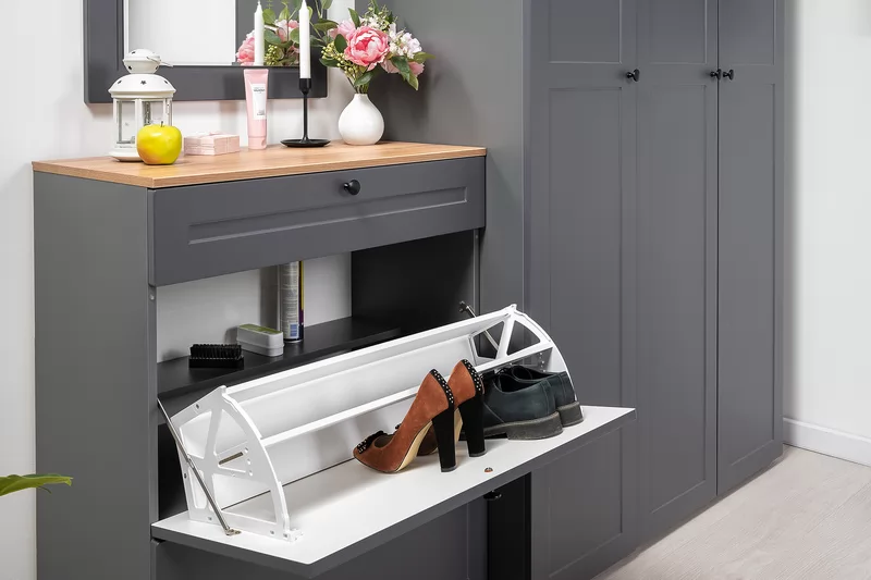 Прихожая доступна в двух цветовых решениях – белый/графит в сочетании с теплым древесным декором.