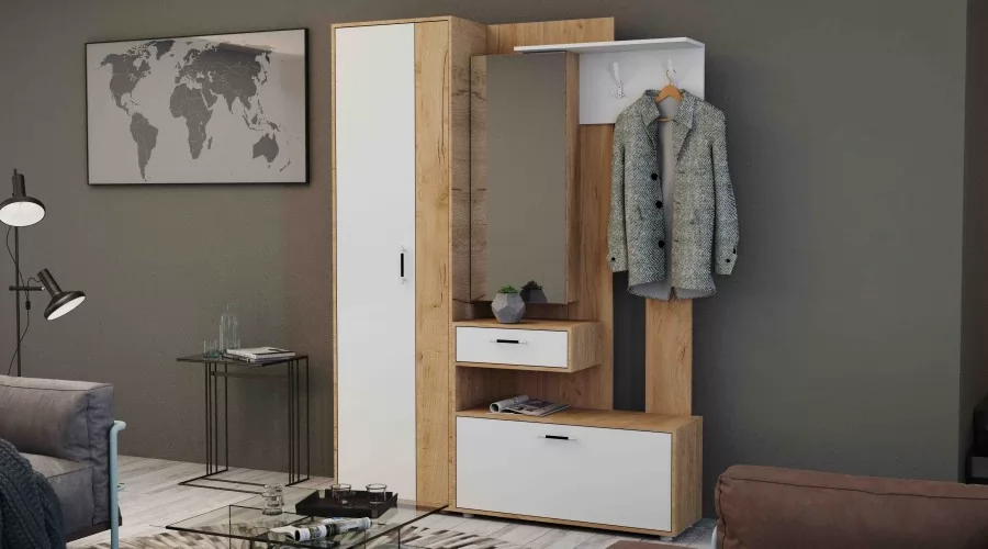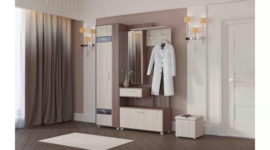 Секция с зеркалом (зеркало имеет широкий фацет по периметру) может быть собрана как на левую, так и на правую сторону. Фасады шкафов универсальные и могут быть установлены в зеркальном отображении, что позволяет открывать шкаф как на левую, так и на правую сторону. В наполнение шкафа-пенала входит выдвижная штанга и четыре полки. В качестве дополнительного декора фасадов использовано декоративное стекло с широким фацетом и рисунком, окрашенное по специальной технологии, усиливающее глубину восприятия. Створка обувницы имеет два газ лифта, выдвижной ящик на роликовых направляющих, применены регулируемые по высоте опоры, высокопрочные крючки. Задние стенки и дно ящика выполнены из ламинированного и облагороженного ЛДВП в цвет корпуса.