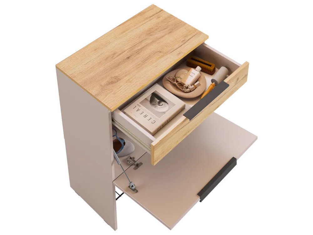 Изготовленная из прочного ЛДСП толщиной 16 мм, обувница обеспечивает надежность и долговечность. Выкатной ящик на шариковых направляющих позволяет легко и плавно открывать и закрывать его, предоставляя дополнительное место для хранения мелочей.