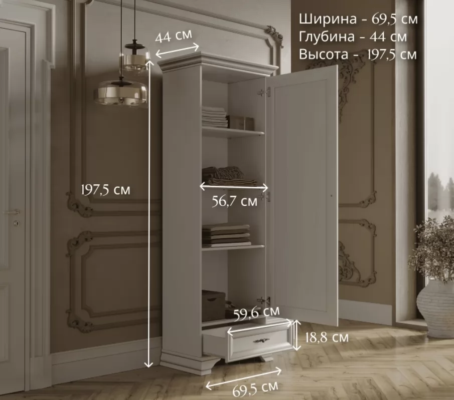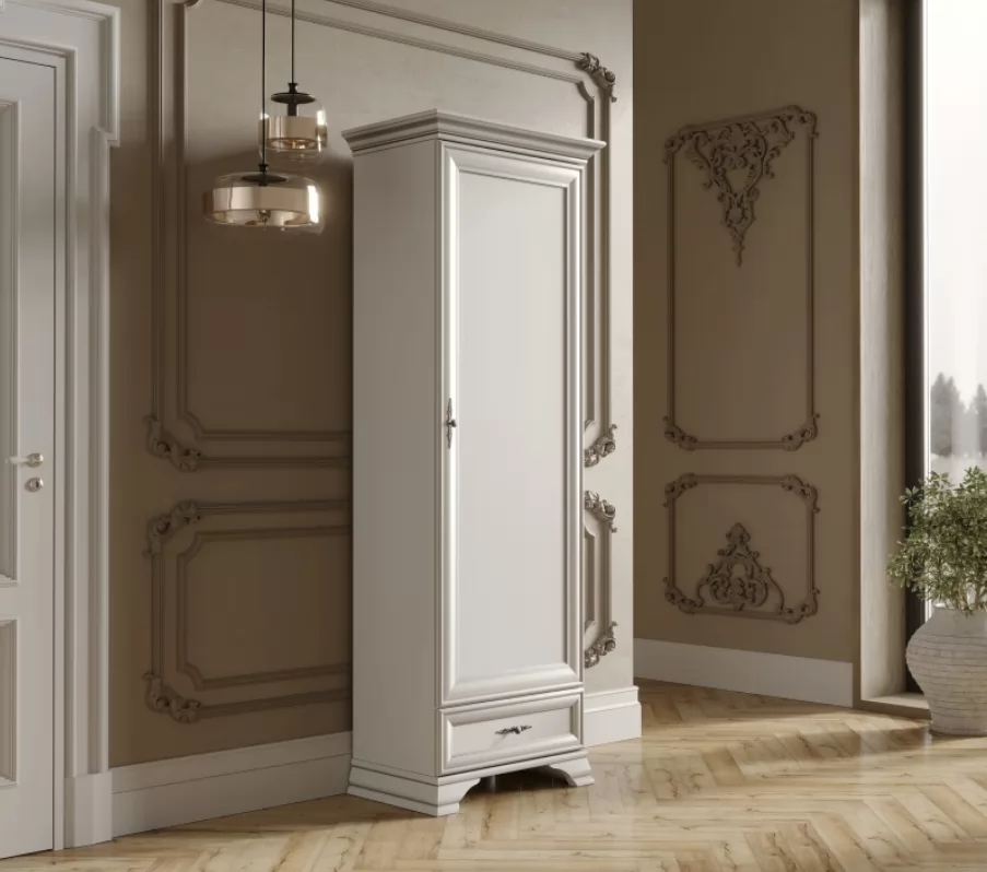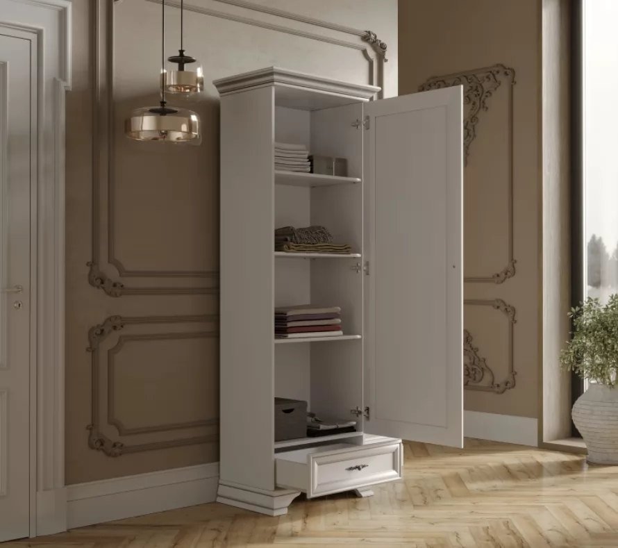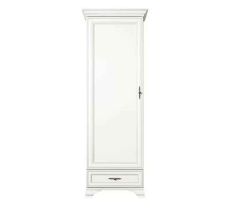 Дверцу можно установить как с правой, так и с левой стороны. Данная деталь позволяет удобно разместить шкаф в любой части комнаты. Металлические ручки с декоративными накладками гармонично контрастируют с белым цветом фасада. Фигурные ножки гарантируют устойчивое расположение на полу.
