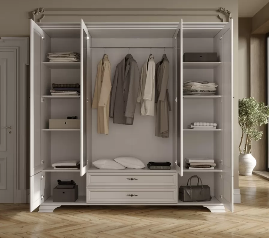 Шкаф имеет обширное внутреннее пространство. Он включает в себя просторный отсек со штангой, боковые полки и выдвижные ящики, что позволяет легко организовать гардероб, включая одежду на вешалках, головные уборы и обувь.