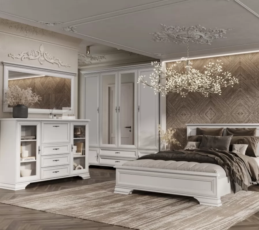 Центральные дверцы с зеркалами не только визуально расширяют пространство, но и позволяют удобно оценить свой внешний вид. Витиеватые ручки придают шкафу винтажный шарм, а прочные ножки из МДФ обеспечивают его стабильное расположение на полу.