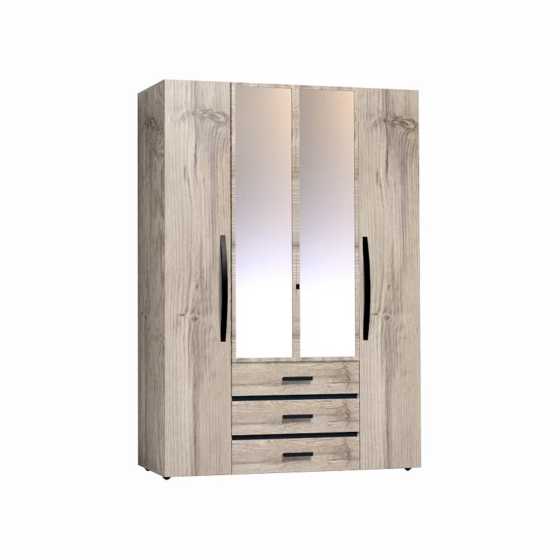 Вместительный распашной шкаф с двумя зеркальными фасадами прекрасно подойдет в современную спальню. Функциональное наполнение шкафа разделено на две симметричные половины, что очень удобно для пользования и зонирования гардероба всех членов семьи. За глухими фасадами скрываются отделения с 4 полочками, регулируемыми по высоте, что делает хранение одежды удобным. Зеркальные фасады шкафа обрамлены вставками из ЛДСП. Изнутри зеркало покрыто специальной защитной пленкой, которая предотвратит падение осколков, если оно разобьется. Элегантная ручка-петля позволит открывать дверцу, не прикасаясь к зеркальному полотну, а, значит, его не придется часто протирать. Вторая зеркальная дверца открывается за торец. Внутри шкафа закреплена стационарная штанга (777 мм), которая выдержит нагрузку 40 кг. Особенно деликатные вещи, постельные принадлежности и другие предметы быта помогут хранить три выкатных ящика глубиной 40 см. Ящики оснащены шариковыми направляющими полного выдвижения, что обеспечит их высокую прочность и абсолютную бесшумность при эксплуатации.