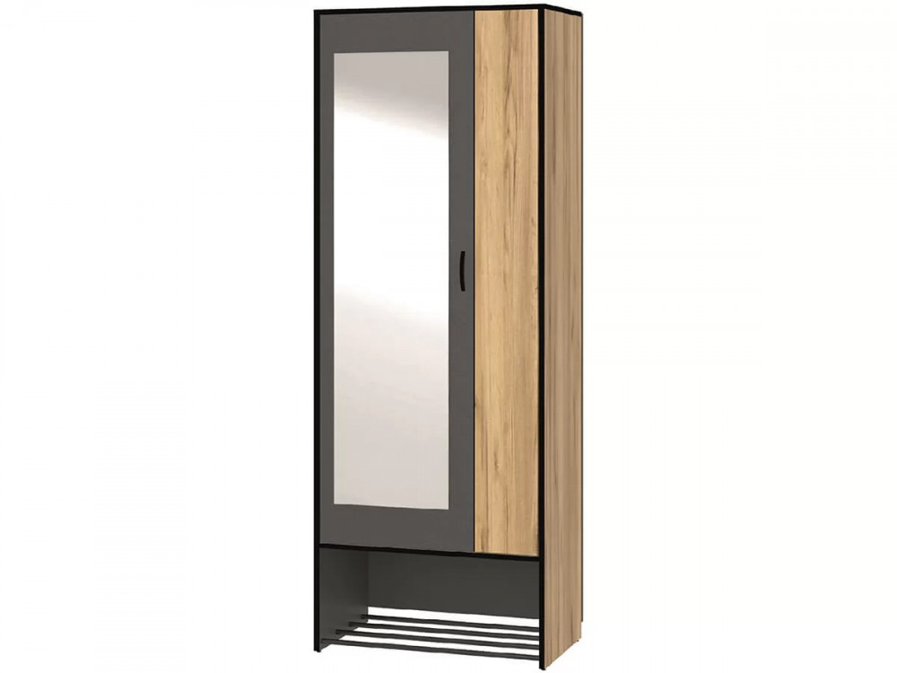 Ширина (мм): 600 Высота (мм): 2000 Глубина (мм): 350 Цвет: Дуб крафт золотой/Темно серый Материал: ЛДСП/Зеркало Вес, кг: 44 Объем, м3: 0.08 Стиль: Лофт Коллекция: Ольга-Лофт Размер зеркала: 296х1450 мм Корпус — ЛДСП 16 мм Кромка ПВХ 0,4 мм Дверцы с доводчиком Ручки — пластик (черный, матовый) Зеркало с фацетом Штанга выдвижная Полка для обуви — металл (черный, матовый).