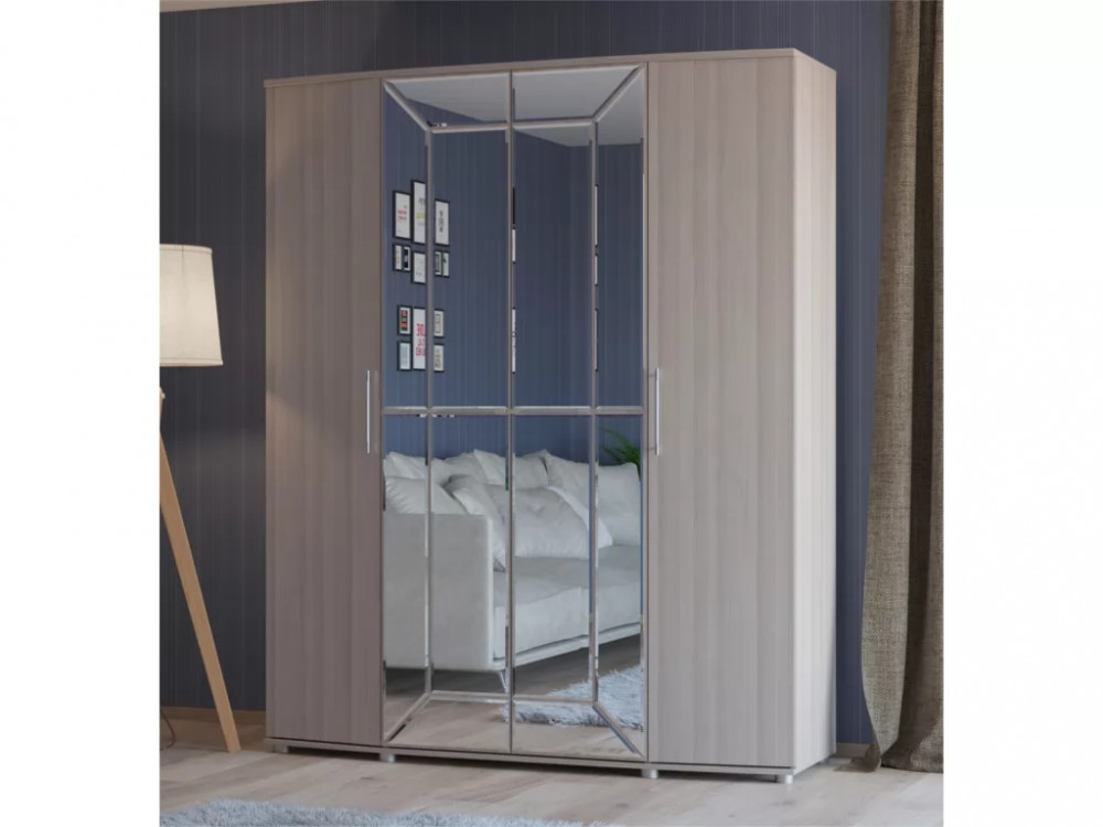 Шкаф с распашными дверями, с двух сторон отделение с тремя антресольными полками и горизонтальными штангами под ними. В центре шкаф украшают зеркала из 12-ти сегментов, внутри расположены антресольная полка, горизонтальная штанга и нижняя полка.
