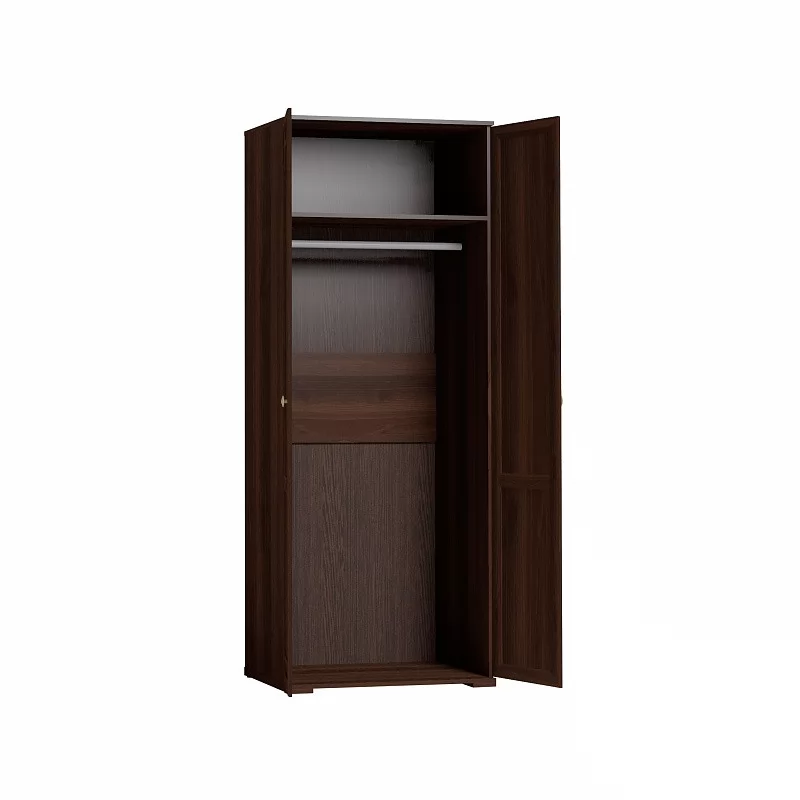В распашном платяном шкафу со стационарной штангой для одежды длиной 757 мм можно разместить до 10 плечиков с тяжелой верхней одеждой. На верхней полке можно хранить аксессуары и коробки с головными уборами.