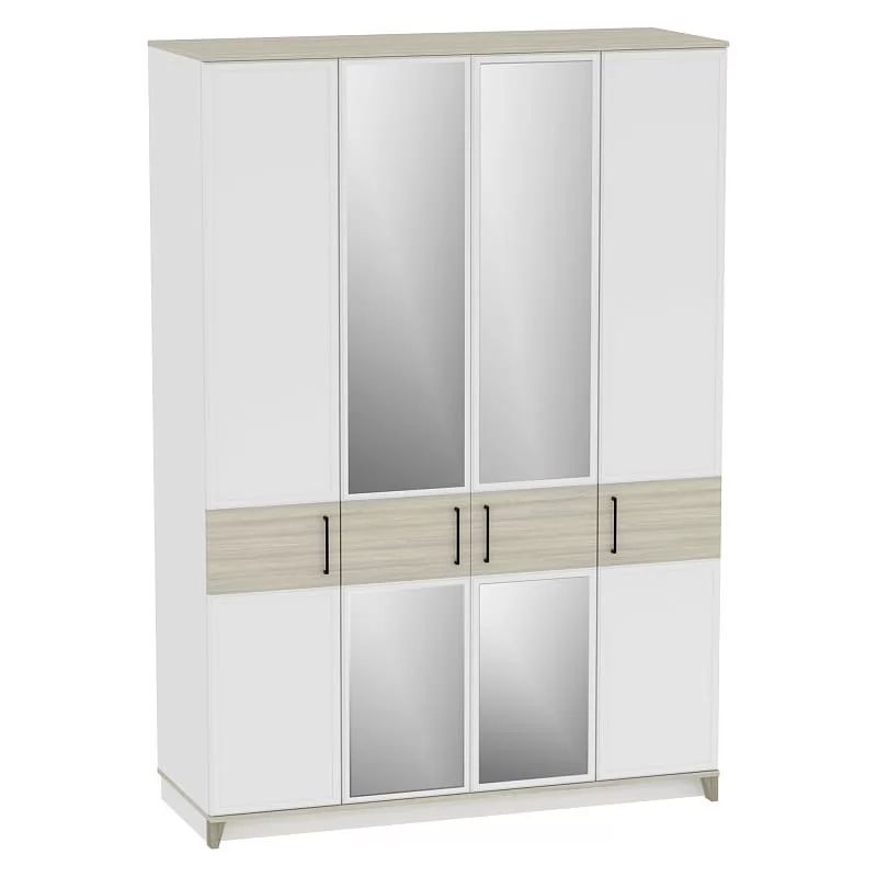 Изысканность стиля подчеркивает тонкий фигурный профиль на фасадах, верх и низ модулей выполнены в древесном декоре, а скошенные опоры из МДФ добавляют мебели в стиле неоклассика из коллекции AURELIO нотку современной эстетики. Петли с доводчиками - для комфортного открывания / закрывания дверок шкафа. Задняя стенка шкафа в древесном декоре устанавливается в паз, поэтому выглядит аккуратно со всех сторон.