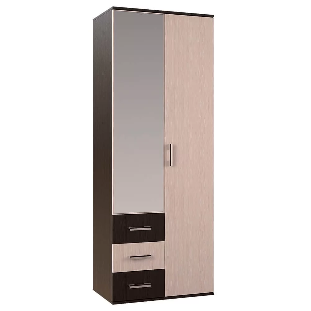 - модель имеет отделение с хромированной штангой для одежды на вешалках, - три выдвижных ящика для белья и аксессуаров, а также верхнюю полку, - на один из фасадов прикреплено высокое зеркало, - изделие выполнено из ЛДСП контрастных цветов венге и дуб аталанта, а также дополнено эргономичными ручками.