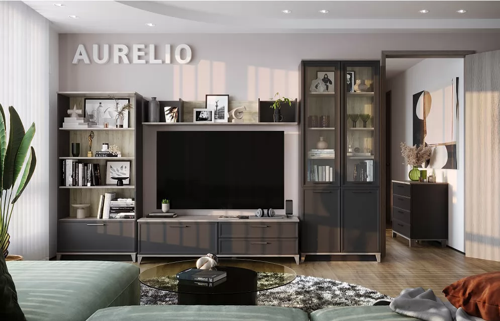 Мебель AURELIO представляет собой классическую мебель в современном исполнении. Корпус мебели изготовлен из высококачественного ЛДСП толщиной 16 мм, что обеспечивает прочность и долговечность конструкции. Фасады выполнены из МДФ с применением профиля, что придает им изысканный и стильный вид. Особое внимание стоит уделить рамочным фасадам шкафов, которые украшены стеклянными вставками и металлическими черными ручками. Это сочетание материалов придает мебели особый шарм и элегантность.
