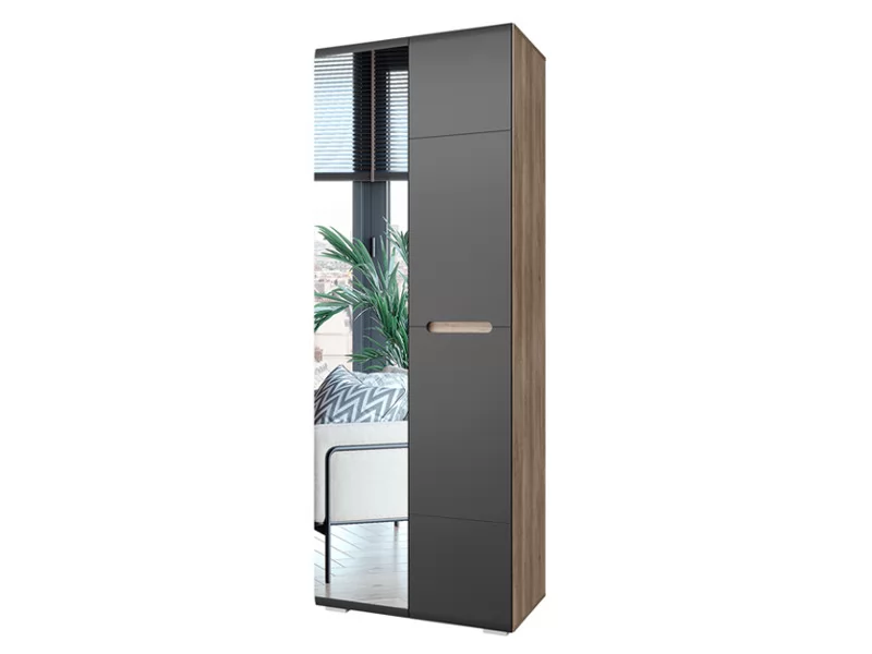 - модель имеет две распашные створки, одна из них полностью зеркальная, а вторая – темного серого цвета с интегрированной ручкой,