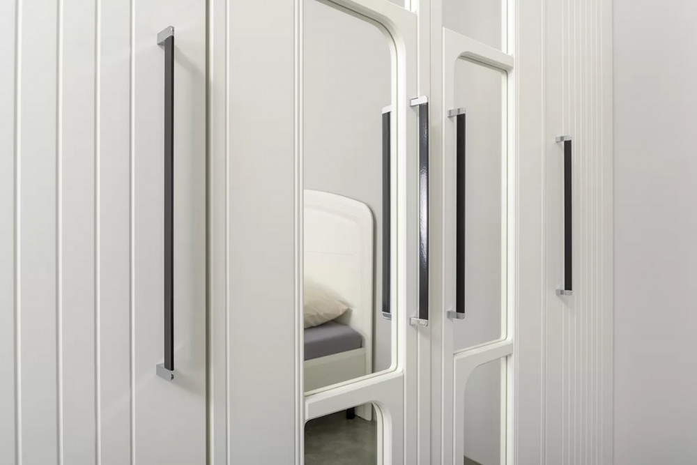 Вся лицевая фурнитура металлическая, графичное и стильное сочетание черного и хромированных деталей эффектно расставляет акценты на мебели.