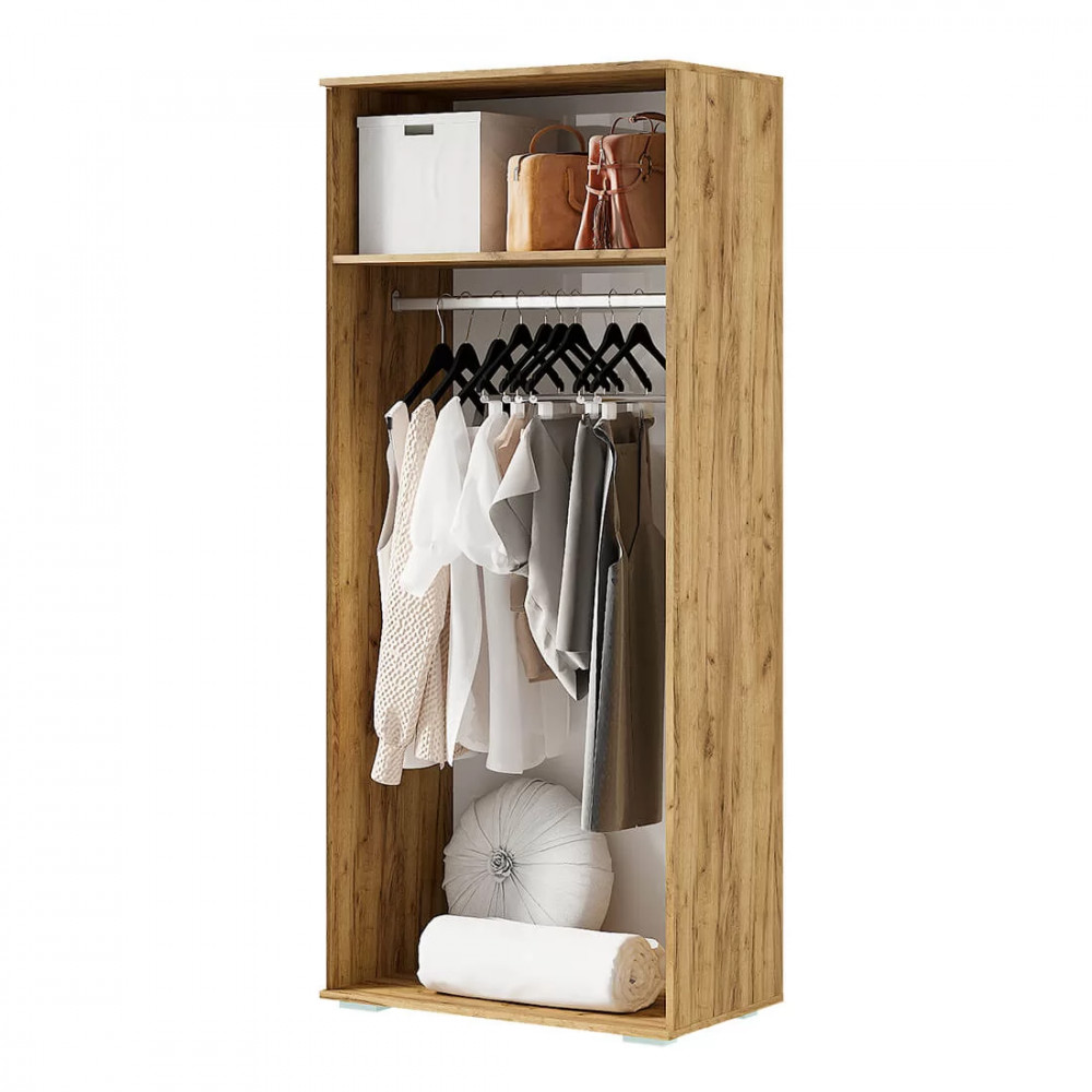 -модель выполнена из ЛДСП натурального оттенка дерева в комбинации со вставкой, эмитирующей бетонную поверхность, -внутренняя комплектация изделия состоит из хромированной штанги для одежды на вешалках и ниш для остальных вещей.