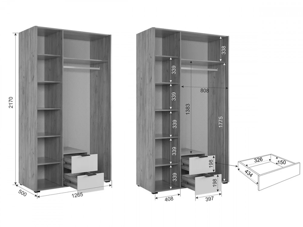 Состоит из: шести полок, двух ящиков выдвижных и штанги для одежды.